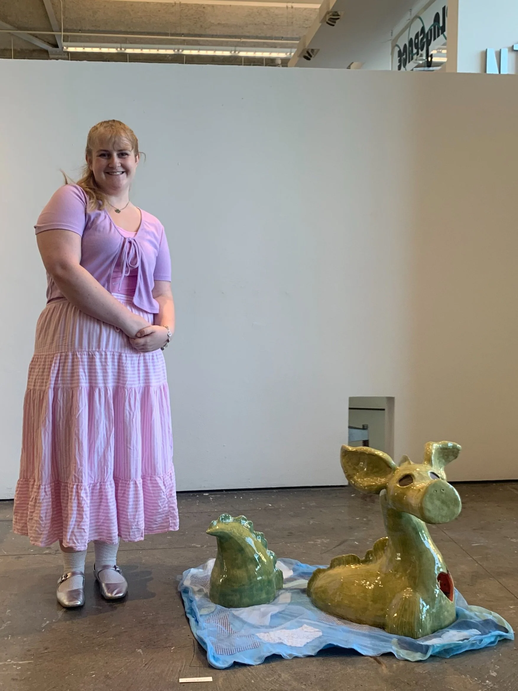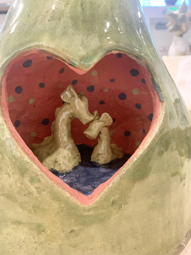 Nessie is a ceramic sculpture that consists of three separate pieces. It’s meant to convey how we can feel emotions within the different parts of our bodies: the stomach (middle piece) portrays a “gut feeling” of being watched or preyed upon, and the bust has a heart cut out to represent the feeling of warmth and love.